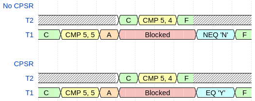 Figure 6 shows the two execution possibilities of the test. The first timing diagram, labeled No CPSR, shows that if the CPSR is not preserved then upon returning to \(T_1\) the Not Equal branch will execute and ‘N’ will be output since \(T_2\) altered the zero flag. The second timing diagram, labeled CPSR, shows that if the CPSR was preserved then upon returnint to \(T_1\) the Equal branch will execute and output ‘Y’ since the zero flag will be restored to \(T_1\)’s state before the thread switch occurred.