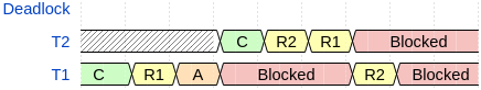 Figure 2 showcases one way a naïve scheduler may be susceptible to a deadlock. In the figure, C refers to the thread being created and started, the yellow background refers to the labeled resource trying to be locked by the process, and the orange A refers to thread one (A)dding \(T_2\), which has higher priority than \(T_1\). Since both threads have a resource required by the other, they both cannot continue to execute–i.e. they cannot release the resource to allow the other one to continue.