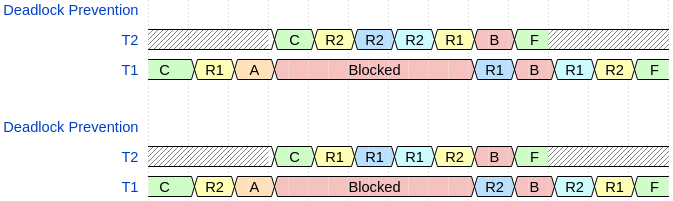 The purple UR1 and UR2 means that the thread unlocks R1 or R2 respectively. The A indicates that \(T_1\) creates \(T_2\). The darker blue means that the mutex lock call automatically unlocked the resource and the lighter blue means that the mutex lock call automatically relocked the resource. Specifically in our diagram, the dark blue R2 in the second timing diagram indicates that the system mutex manager automatically unlocks R2 when T2 is trying to acquire R1, in order to see if any higher priority threads are waiting on R2. Since no higher priority threads are waiting on R2 it is also automatically relocked, shown by the lighter blue R2. Similarly, the dark blue R1 in the second timing diagram indicates that the system mutex manager automatically unlocked R1 when T1 is trying to acquire R2 in order to see if any higher priority threads are waiting on R1. In this case, T2 is waiting on R1, so it wakes up and completes its task. Execution then resumes on T1 and it is able to relock R1 and then successfully acquire R2, with the deadlock prevented.