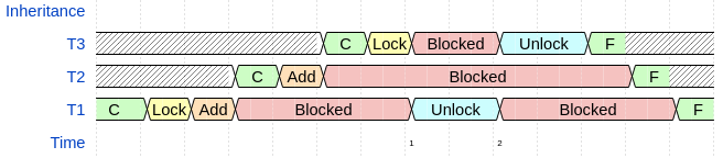 Figure 1 showcases the priority inversion condition. In the figure, C refers to the thread being created and ran, the ‘Add’ blocks are when \(T_1\) creates \(T_2\) and \(T_2\) creates \(T_3\), and the number associated with the thread implies its priority (higher number means a higher priority in the figure). Thus, we see that \(T_2\) completes before \(T_3\), which is characteristic of priority inversion.