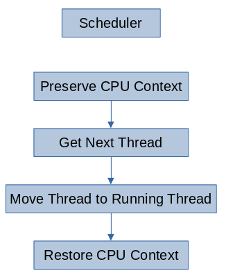 The thread switching algorithm, i.e. the scheduling algorithm, is fairly basic. It preserves the current context, gets the next thread, and then restores the new threads context. For the Raspberry Pi 2B, i.e. a ARMv7-A system, a threads context consists of five main components: the current value of the program counter, the current stack pointer, the current linking register (i.e. the return address of the current function), the current program status register, and the general-purpose registers r0-r12. Preserving these contexts involves adding the general-purpose register values to the stack and storing the special components in the Thread’s structure managed by the scheduler.