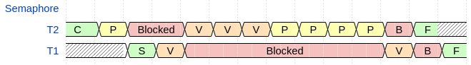 Thus, we see that \(T_2\) was only blocked when the semaphore counter was zero, after the first P and after the fourth P in the series of sequential Ps. This is consistent with the expected behavior of a semaphore in an RTOS, ensuring the determinism of Jobbed’s semaphores.