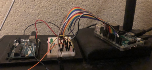 Pictured above is the setup where the arduino is hooked up to pin 16 and a pushbutton is hooked up to pin 12 with an LED for manual verification of signal reception.